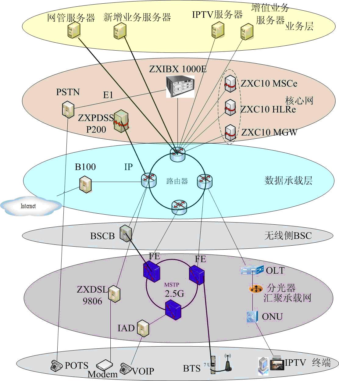 - 1. 终端层: 终端层包括传统的语音POTS 话机,internet业务终端Modem,VOIP语音话机,无线业务手机,IPTV终端等。