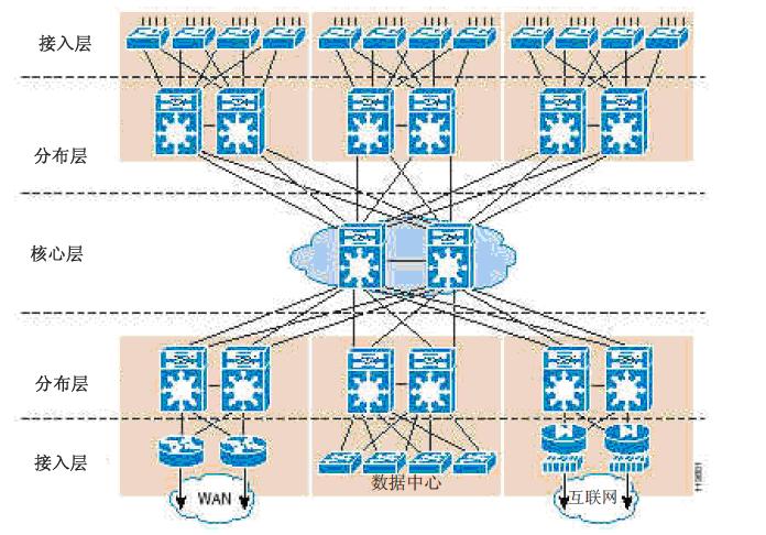 采用层次化设计,特定设备的容量、特性和功能均针对其网络位置和作用进行了优化,以提高可扩展性及稳定性。当流量通过层次化结构中的收敛点,沿着接入层-分布层-核心层传输时,流量数量及其相关的带宽要求都随之增加。层次化设计每一层的功能都很分明,无需全部网络节点互联的全网状网络。 模块化网络的组件易于复制、重新设计并扩展,无需每次添加或拆除模块时都重新设计整个网络。您可以运行或中断任何组件的运行,而不会影响网络的其他部分。这种功能可促进排障、故障隔离和网络管理。